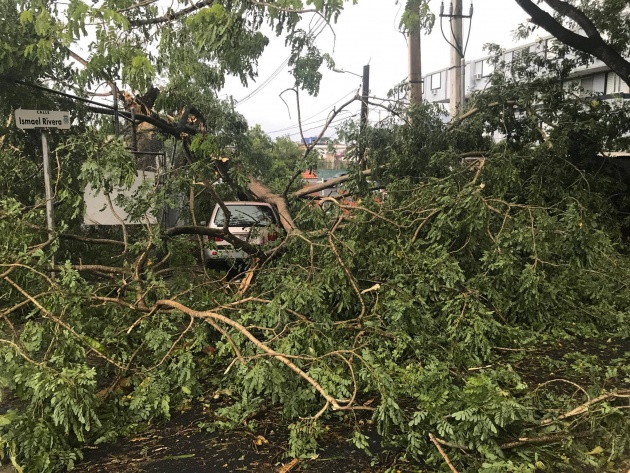 Un árbol de gran tamaño, cayo sobre un vehiculo en la calle Ismael Rivera en Santurce. Cerca de las 7 de la mañana la calle aun permanece cerrada y no habían comenzado labores de remoción