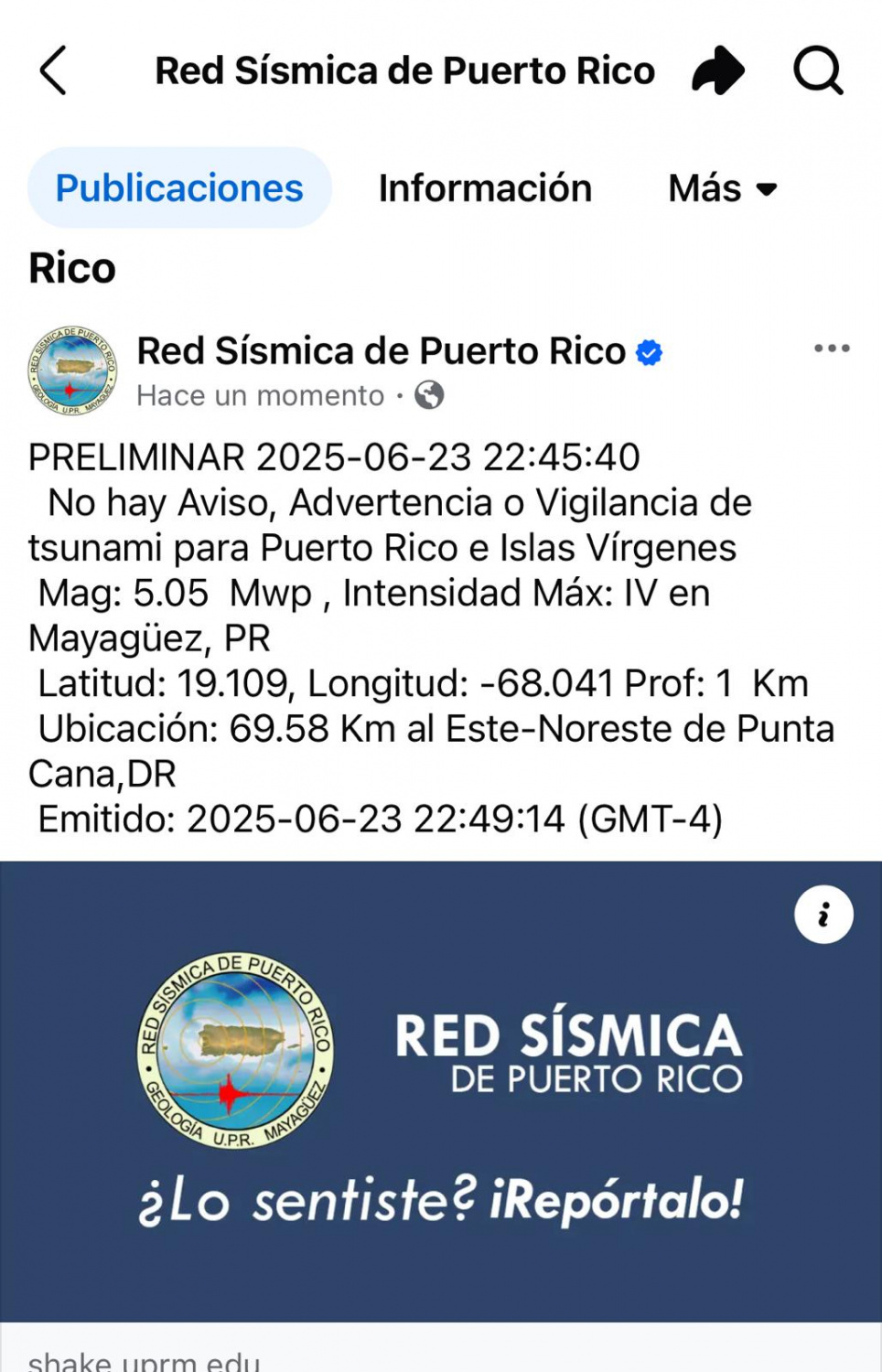 Un fuerte sismo sacudió esta noche la región del Caribe, siendo percibido en gran parte de Puerto Rico, especialmente en el área este y noreste de la isla. El evento sísmico tuvo como epicentro una zona marina localizada a unas 31 millas de Punta Cana, en aguas del Océano Atlántico.