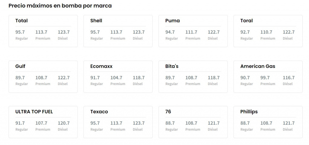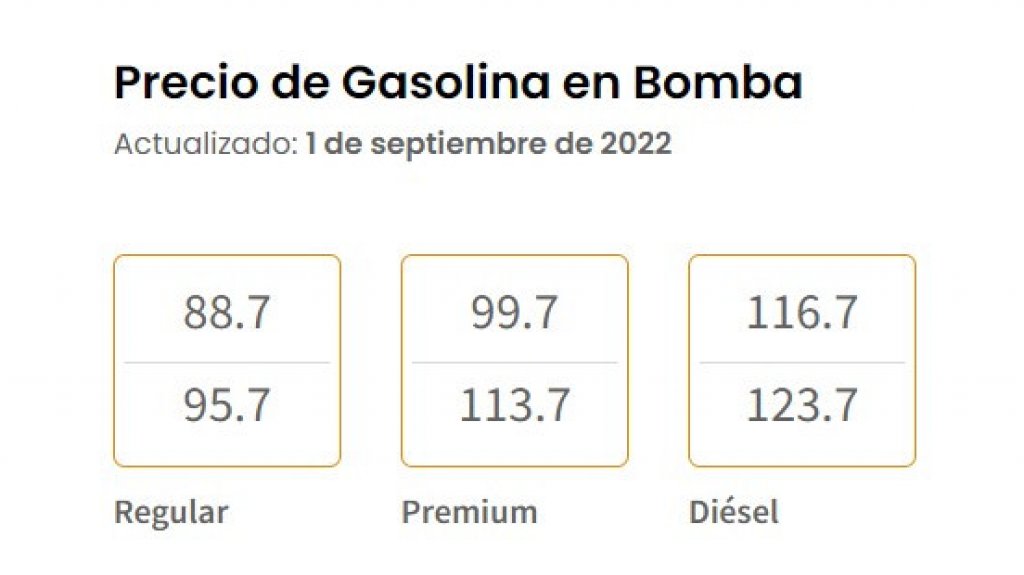 De esta manera, para hoy el precio en bomba del litro para la gasolina regular es de entre 88.7 (ayer, 91.7) y 95.7 (era de 97.7); para premium, de 99.7 y 113.7 (eran de 106.7 y 115.7); y para el diésel, de entre 116.7 (era de 120.7) y 123.7 (hasta ayer, 125.7). INS