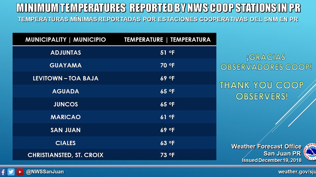 En un publicación en su cuenta de Twitter @NWSSanJuan, el SNM colgó una gráfica con las temperaturas mínimas reportadas el miércoles por Observadores del Programa Cooperativo.