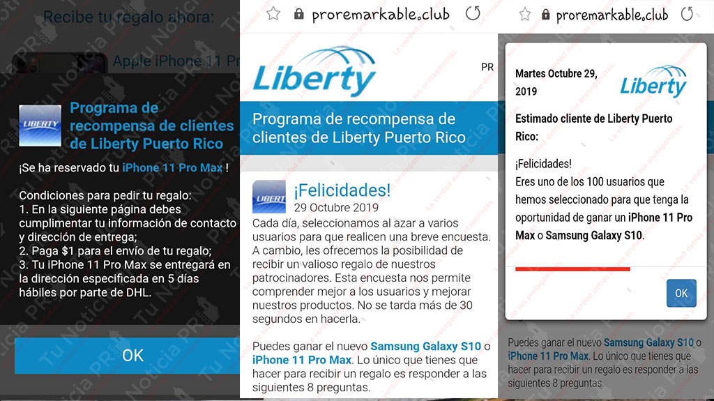 Los mensajes, los cuales prometen premios como el nuevo iPhone 11 Pro Max o el Samsung Galaxy S10, tienen los logos de la compañía y no vienen de ninguna de las cuentas oficiales de Liberty. Algunos de ellos tienen "proremarkable.club” como su dirección de origen.