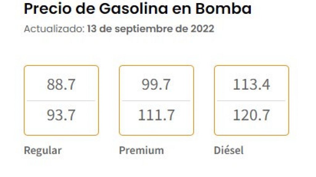 De tal manera que para hoy el precio en bomba del litro para la gasolina regular es de entre 88.7 y 93.7; para premium, de 99.7 y 111.7; y para el diésel, de entre 113.7 y 120.7. INS