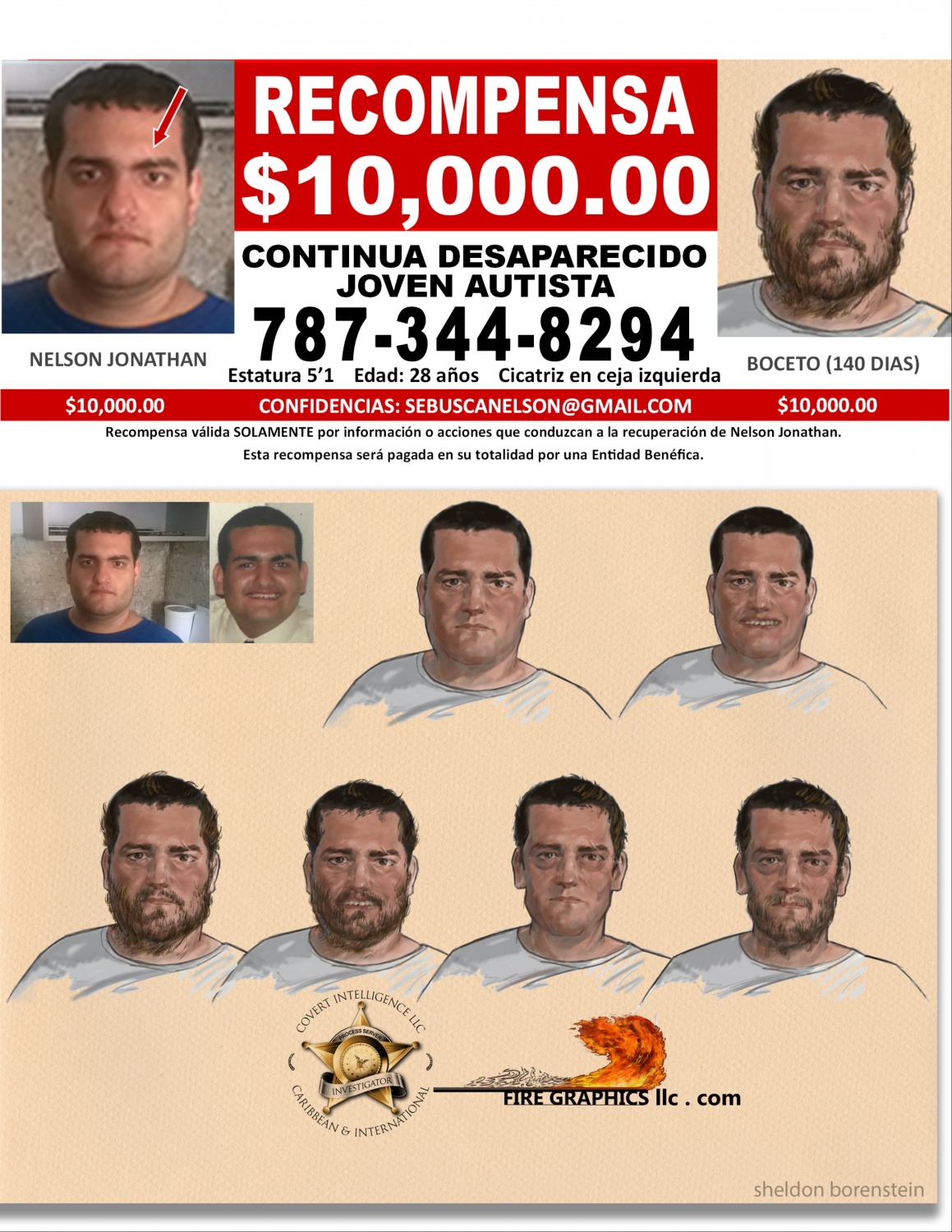 Este servidor, investigador privado internacional Fernando Fernández, junto a mi asociado, el famoso artista forense Sheldon Borenstein, estamos lanzando una campaña masiva de identificación para dar con el paradero de Nelson Jonathan. Borenstein produjo un boceto en 3D que se estará distribuyendo por todos los medios de comunicación, donde la ciudadanía podrá ver cómo puede estar Nelson Jonathan hoy, después de tanto tiempo a la intemperie y sin cuidados. Hay otras cuatro personas trabajando en el grupo de apoyo, incluyendo al Sr. Milton Martínez, tío de Nelson Jonathan.