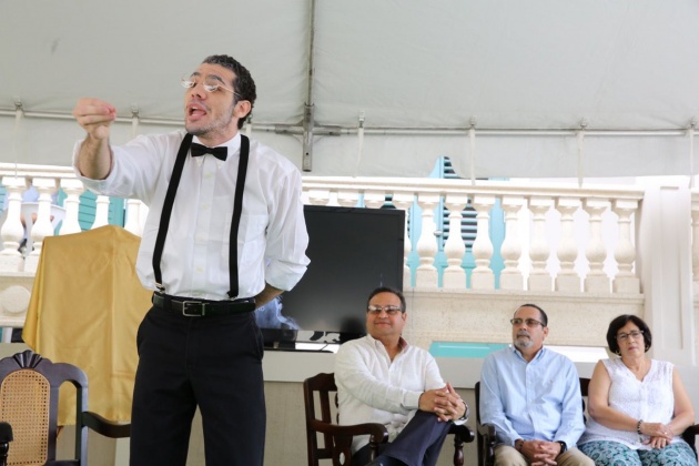 El actor Marcos Acosta interpreta a Peyo Mercé, del cuento Santa Clo va la Cuchilla, como preámbulo al anuncio de la conmemoración del centenario del natalicio de Abelardo Díaz Alfaro. Observan el alcalde de Caguas William Miranda Torres; Abelardo Díaz, hijo y su esposa Wanda L. Flores.