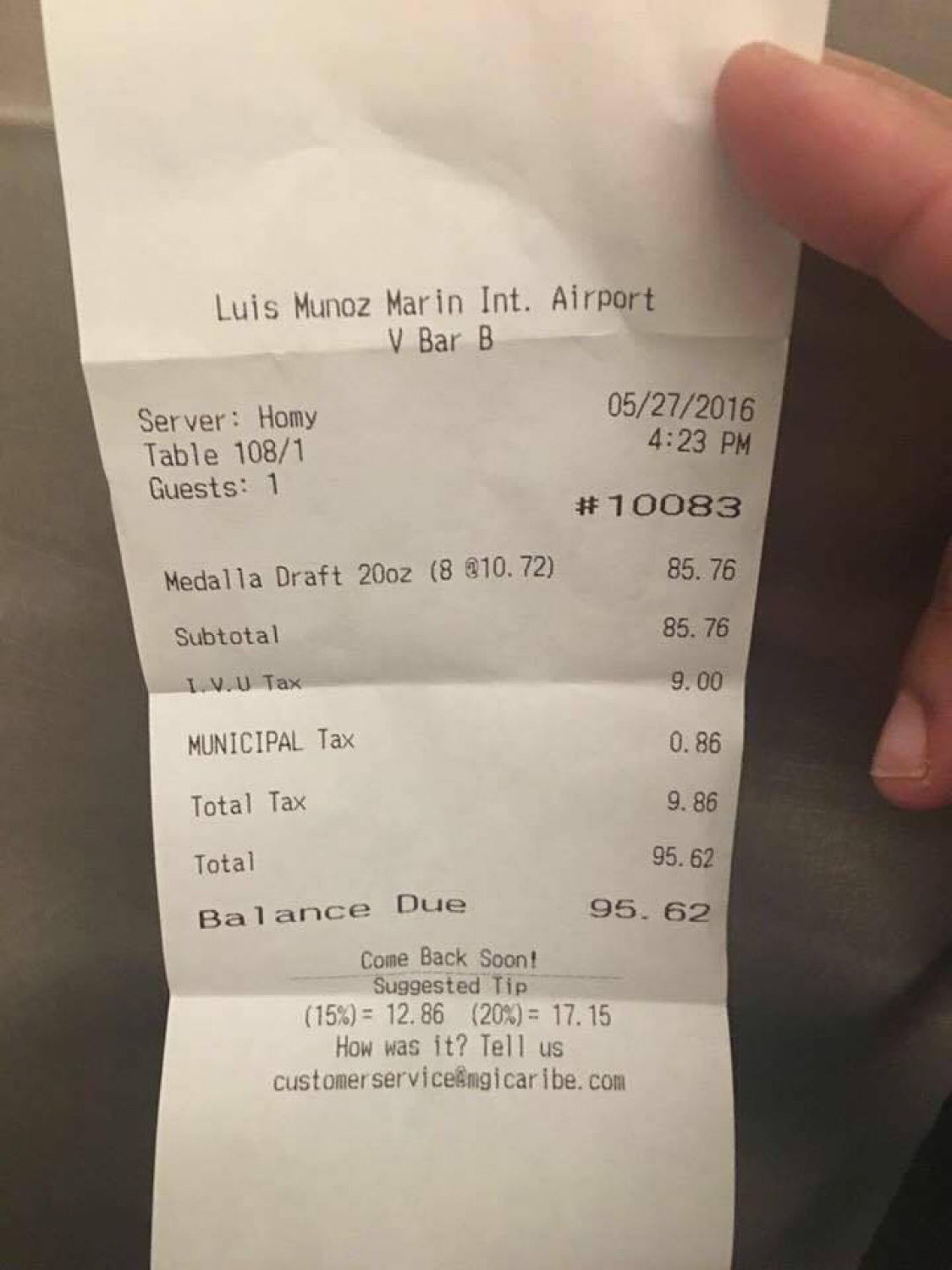 Una foto de un recibo de compra de uno de los bares que alberga el aereopuerto Luis Muñoz Marín, se ha rtornado viral luego que un consumidor divulgara cunato le costo darse 8 cervezas "Medalla”en el lugar.