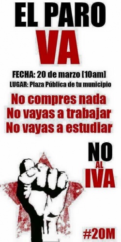 Varios sectores están convocando por medio de las redes sociales, a un paro Nacional en contra del IVA. El llamado es a que el próximo 20 de marzo a las 10 am.