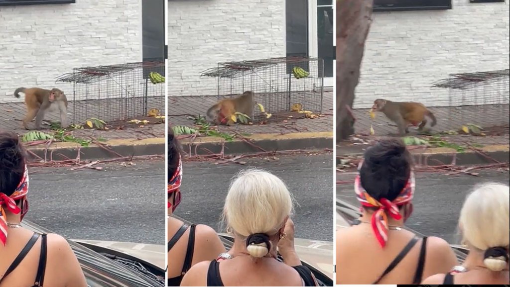 El DRNA colocó trampas con frutas en el área. El mono, sin embargo, entra a las jaulas, agarra su comida y vuelve a subir tranquilamente al árbol en el que se refugia.