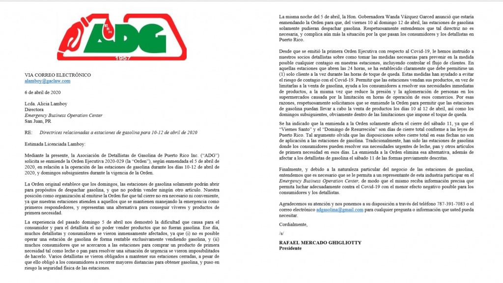 Por tal motivo, Mercado cursó una carta a la gobernadora Vázquez Garced para alertar sobre las consecuencias de esa determinación y solicitó que a los Detallistas de Gasolina sean incluidos en el Emergency Business Operation Center, de modo que el mismo reciba información precisa que