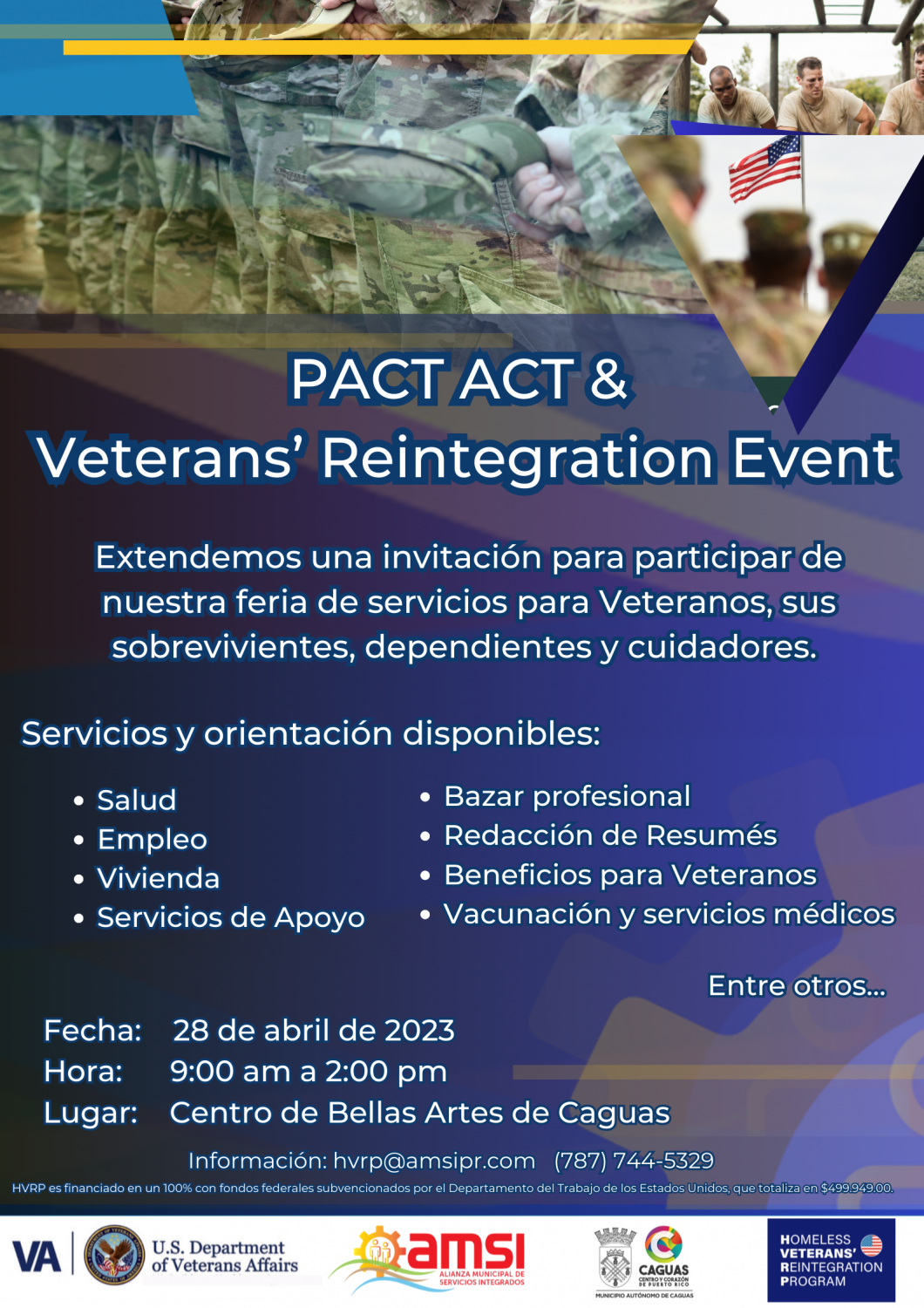 Los veteranos tendrán la oportunidad de acceder a diversos servicios de salud, empleo, vivienda y asistencia, como parte del PACT Act & Veterans’ Reintegration Event, a celebrarse el viernes, 28 de abril de 2023 en el Centro de Bellas Artes de Caguas.