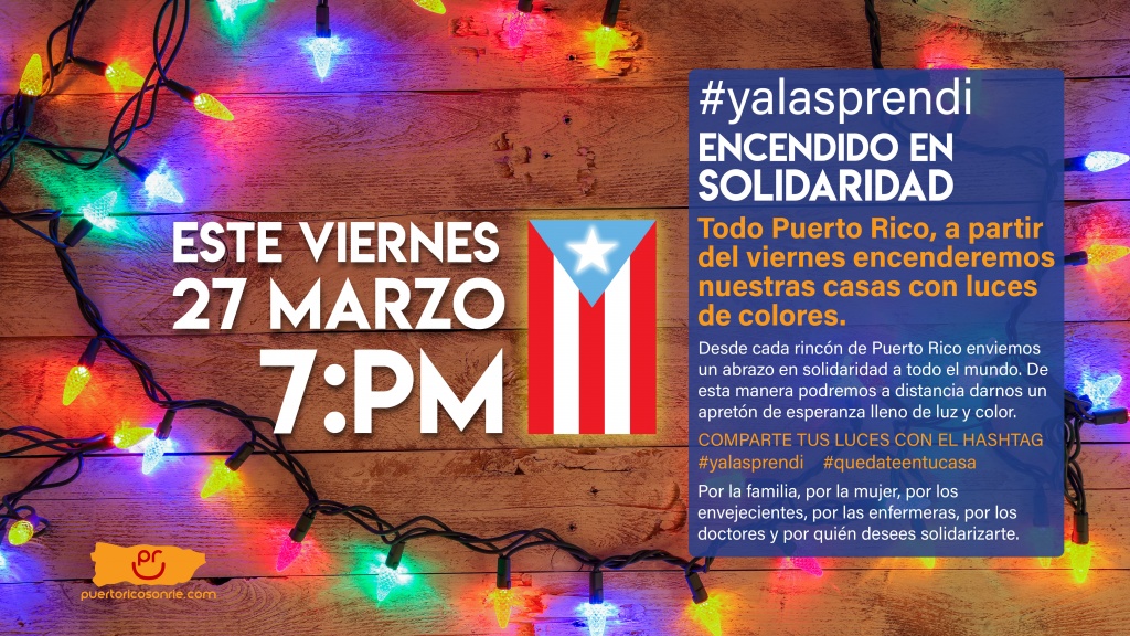 Las clásicas "bombillitas de Navidad" serán esta vez la manera de expresar la solidaridad boricua. La Organización Puerto Rico Sonrie, está invitando a que de una manera muy creativa todo Puerto Rico se una para enviar un abrazo de solidaridad al mundo entero. "Estamos en cuarentena y entendemos que al encender las luces de colores nos estaremos enviando y dando a distancia ese abrazo de esperanza lleno de luz y color", dijo Juan Carlos Torres Cartagena, coordinador del evento #yalasprendi (Encendido de Solidaridad).