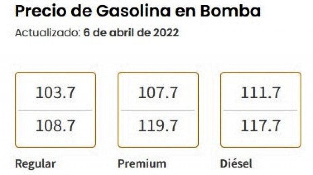 De esta manera, para hoy el precio recomendado en bomba para la gasolina regular es de entre 103.7 (era de 104.7) y 108.7 (ayer, 109.7); para premium, de entre 107.7 (el precio se mantiene) y 119.7 (era de 120.7); y para el diésel, de entre 111.7 (antes, 113.7) y 117.7 (era de 119.7).
