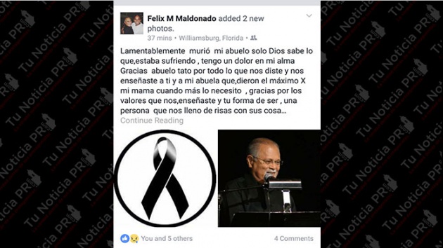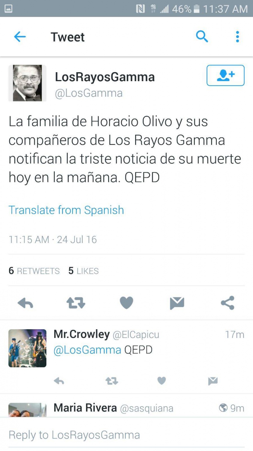 Horacio Olivo, reconocido actor que conforma el cuarteto de los Rayos Gamma,  Su nieto felix Maldonado hizo el anuncio atreves de su cuenta de Facebook.