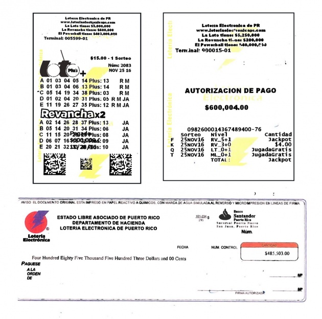 El ganador del premio de $600 mil de la Doble Revancha del pasado 25 de noviembre que se vendió en Supermax de la Avenida de Diego en San Juan cobró su premio en un pago de $485,503 luego de descontadas las contribuciones. Ahora la Lotería Electrónica está en espera del nuevo ganador de los $5.5 millones de Loto Plus del pasado viernes que cayó en el Supermercado Selectos de Aguadilla, informó Víctor Pizarro Núñez, secretario auxiliar del Negociado de las Loterías.