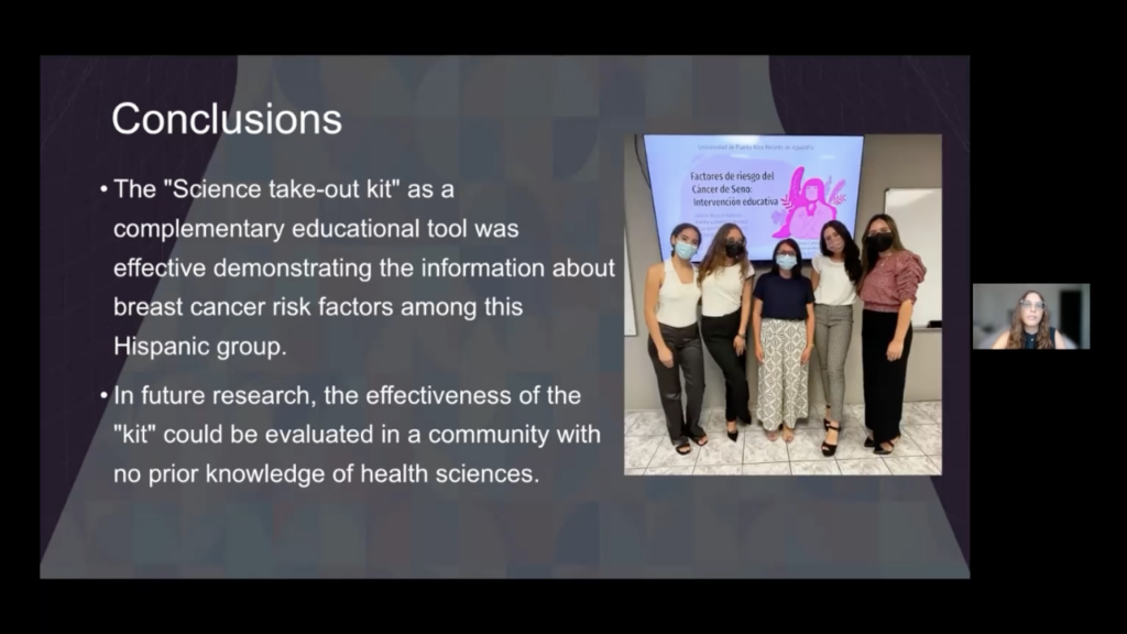El "Science Take Out Kit” se trató de una intervención educativa para aumentar el conocimiento de la comunidad puertorriqueña sobre los riesgos del cáncer de seno y la variedad de métodos para la prevención de esta condición. Además, midieron la efectividad de los kits para educar a la comunidad e identificaron si era un tema importante para estos.