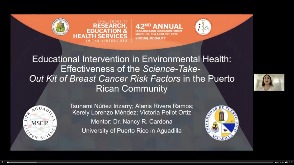 Cuatro estudiantes del Departamento de Ciencias Naturales de la Universidad de Puerto Rico en Aguadilla (UPRAg) presentaron a principios de abril su kit educativo que mostró a la comunidad puertorriqueña los factores de riesgo de cáncer de seno en el 42do. Foro Anual de Investigación y Educación del Recinto de Ciencias Médicas de la UPR (evento virtual).