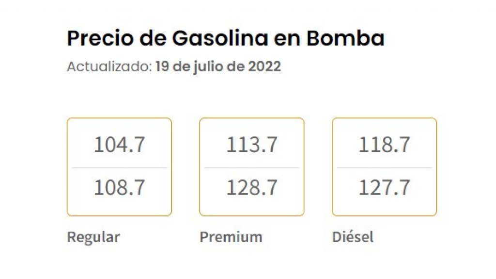 Los conductores que acudan a estaciones hoy, martes, deben encontrar la gasolina regular entre $104.7 y $108.7. Ayer se encontraba en $102.7 y $107.7. Mientras que los precios para la gasolina premium aumentó a $113.7 y $128.7, de $109.7 y $128.7 que registraba ayer. Los que utilizan diesel podrán observar una baja en precio. Los precios deben estar entre $118.7 y $127.7. Ayer estaba entre los $120.7 y $129.7.