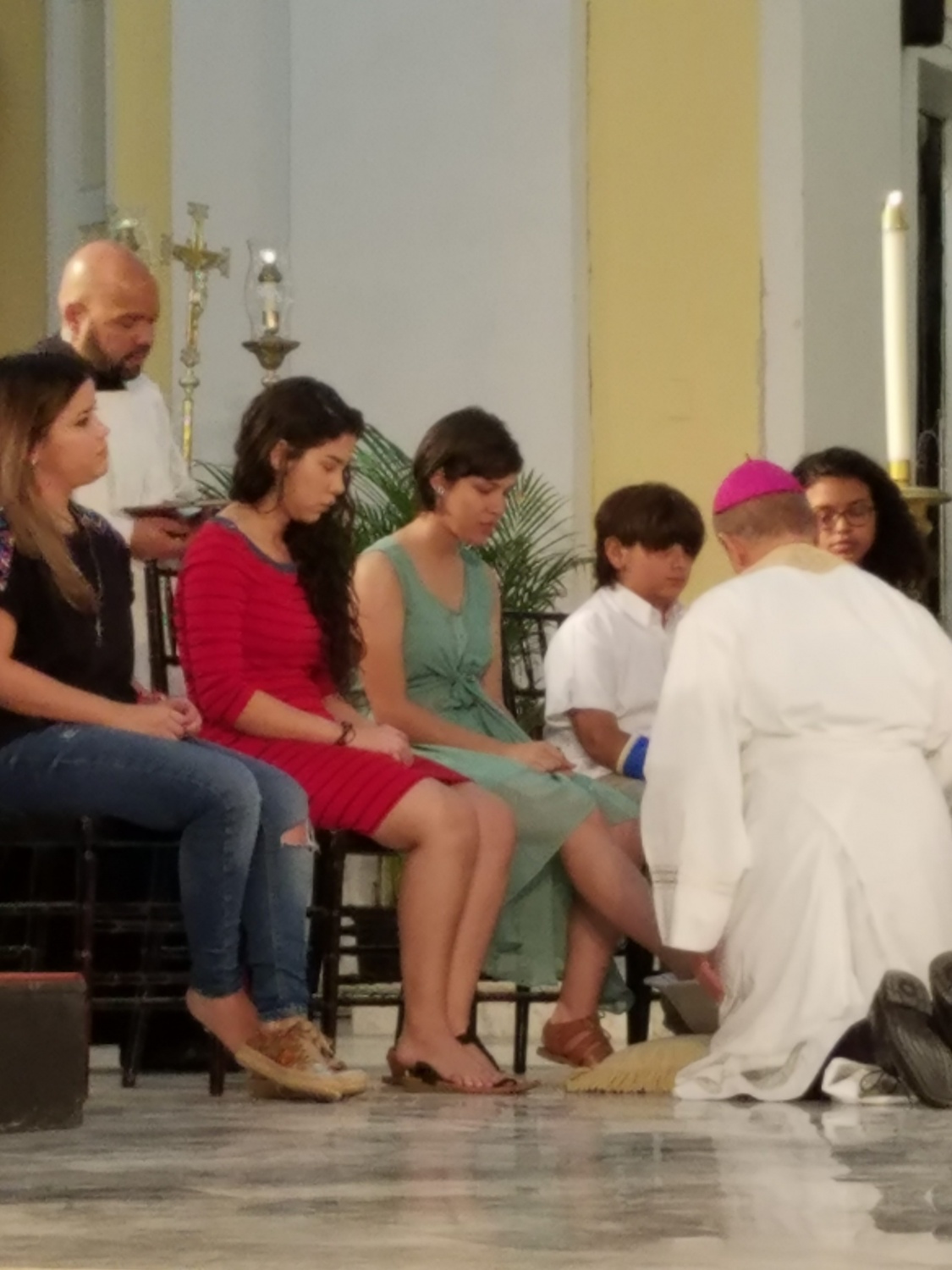 Como parte de la tradicional eucaristía, el celebrante conmemora el noble gesto de Jesús al lavar los pies a los 12 apóstoles, que en esta ocasión fueron representados, se indicó a la agencia Inter News Service (INS), por alumnos de Colegio Nuestra Señora de la inmaculada Concepción, en Santurce.