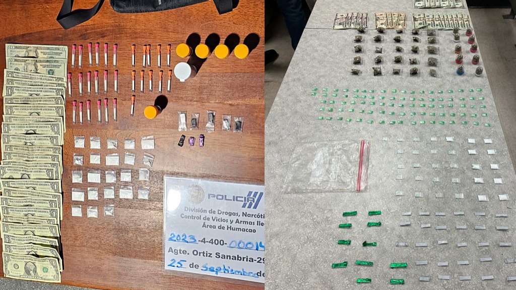 En Naguabo, Nathanael Pagan Bonilla, de 22 años, fue detenido en los predios del residencial Ignacio Morales Dávila con 23 bolsitas de cocaína, 29 cápsulas de crack, 8 decks de heroína, 6 copos de marihuana y $61 en efectivo. El caso también se someterá al fiscal para la presentación de cargos.