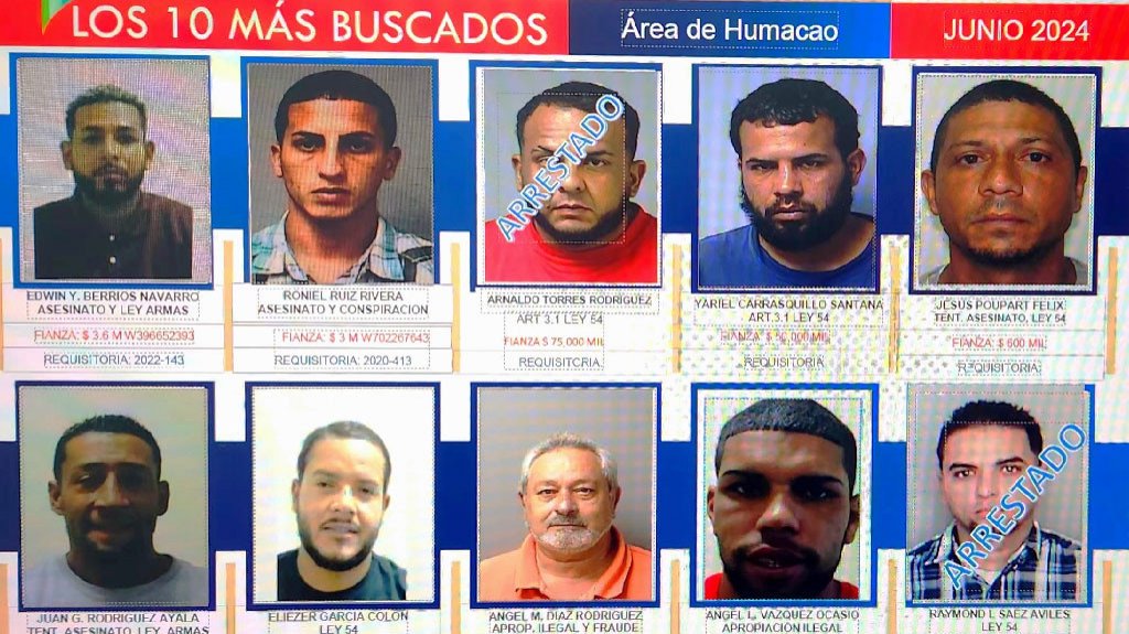 El Negociado de Inteligencia y Arrestos del área policíaca de Humacao sigue tras la pista de "Los 10 Más Buscados” de la región, quienes enfrentan cargos por delitos graves como asesinato, tentativa de asesinato, violaciones a la Ley de Armas y violencia doméstica, entre otros. Dos de los fugitivos tienen fianzas millonarias por delitos de asesinato.