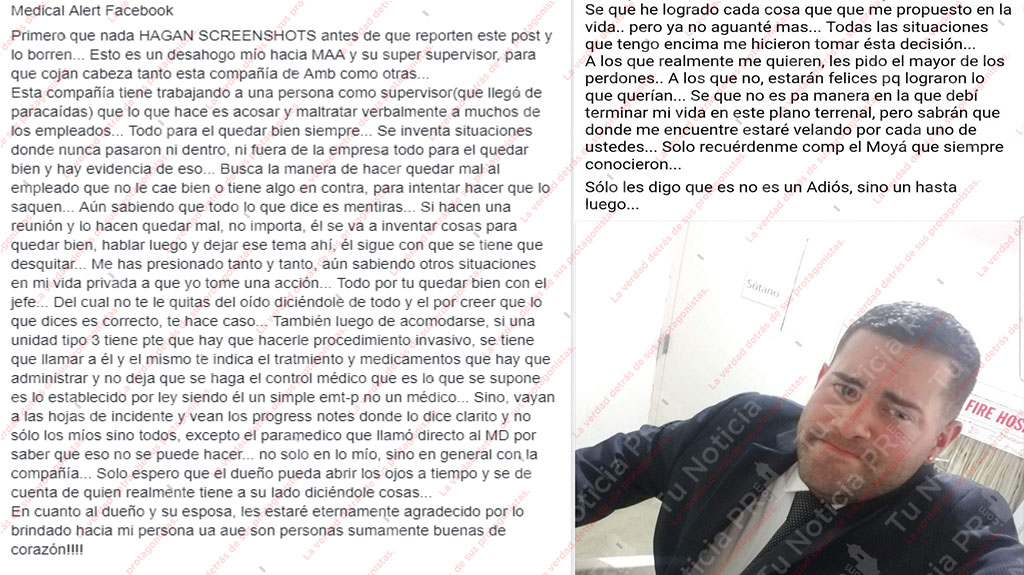 Un segundo mensaje en el mismo Facebook explicaba alegadas injusticias que suceden en la compañía de ambulancias para que trabajaba.