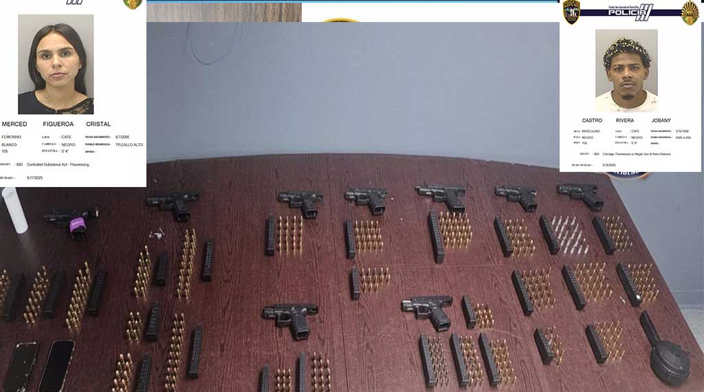 En el negocio Flow Miami, ubicado en la calle Janda del Residencial Manuel A. Pérez, fueron arrestados Jobany Castro Rivera de 27 años y Cristal Merced Figueroa de 24 años, a quienes se les ocupó como evidencia una pistola Glock modificada para disparar en automático, municiones, abastecedores, marihuana y un vehículo Hyundai Accent.