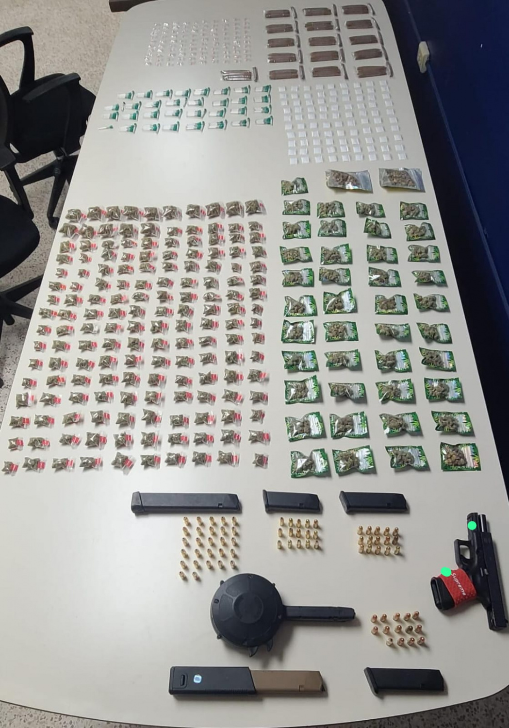 En el residencial Alejandrino, fueron arrestados Yamkel Meléndez De Jesús, de 21 años, y Rafael Díaz Cotto, de 39 años. Se les ocuparon 42 bolsas de cocaína, 63 cápsulas de crack, 56 bolsas de marihuana, 12 cigarrillos de marihuana, 13 decks de heroína y $130.00 en efectivo. Además, se encontró una pistola Glock 19 calibre 9 milímetros modificada para disparar automático, 71 municiones calibre 9 milímetros, 6 cargadores, 90 bolsas de cocaína, 203 bolsas de marihuana, 100 pastillas, 156 cápsulas de crack y 80 cigarrillos de marihuana en el mismo lugar.