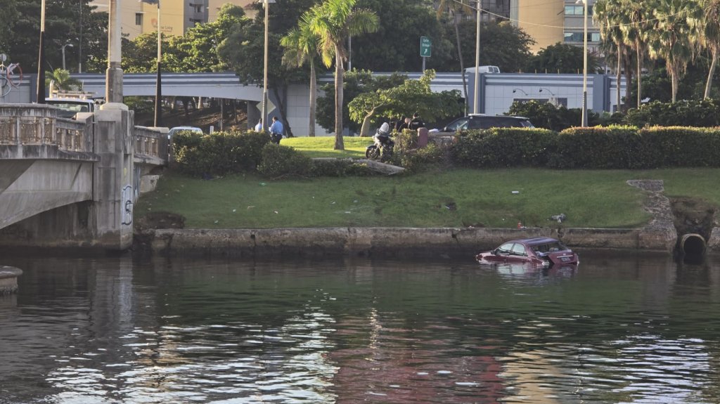 Un conductor identificado como Jan Paul Mouriz Blandino termino dentro de la laguna del condado luego que mientras transitaba por la avenida Luis Muñoz Rivera impacto una valla de cemento del puente dos hermanos y termino dentro de la laguna del condado con todo y auto un toyota Camrry color vino.
