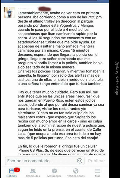 Según las víctimas los hombres cruzaban desde el área de Santurce y cometen los atracos. Los asaltantes según descritos por las víctimas son tres jóvenes entre las edades de 14 y 18 años enmascarados y con armas de fuego.