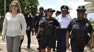Foto del momento que la alcaldesa inaugura el cuartel en el parque que hoy solo hay un retén y se convirtió en ATH de asaltantes