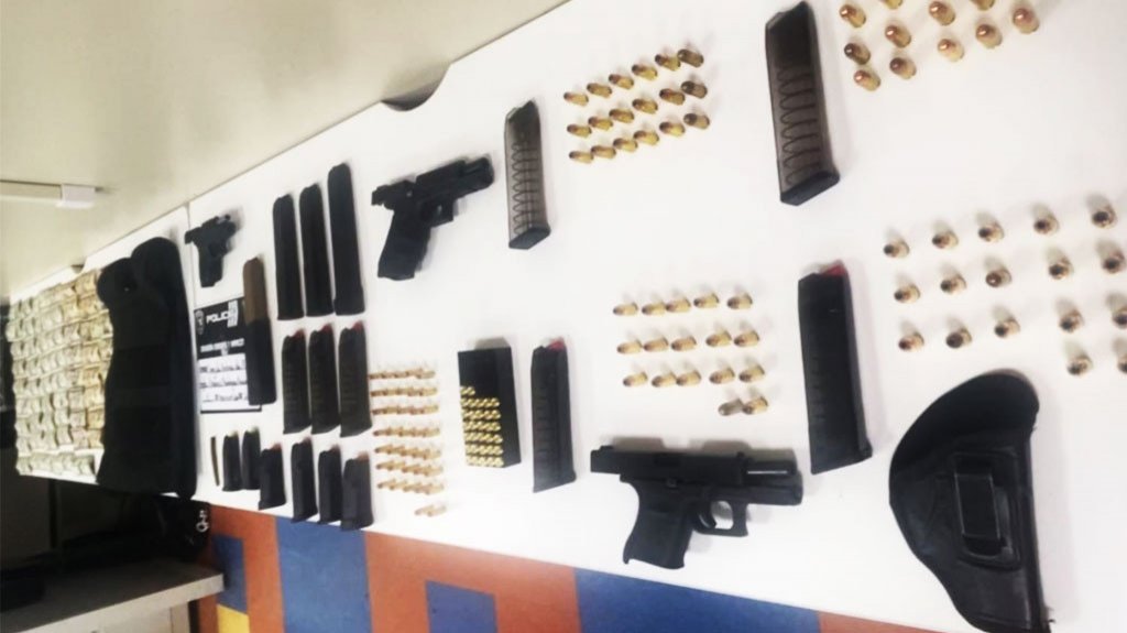 El detenido, identificado como Carlos Costales González, de 22 años, tenía en su posesión una pistola Glock negra calibre .45, una pistola Glock .40, una pistola Taurus negra calibre 9mm, 17 cargadores Glock, dos cargadores Taurus, 72 balas calibre .45, 37 balas calibre 9mm, 32 balas calibre .40, un cigarrillo de marihuana y $336.00 en efectivo.