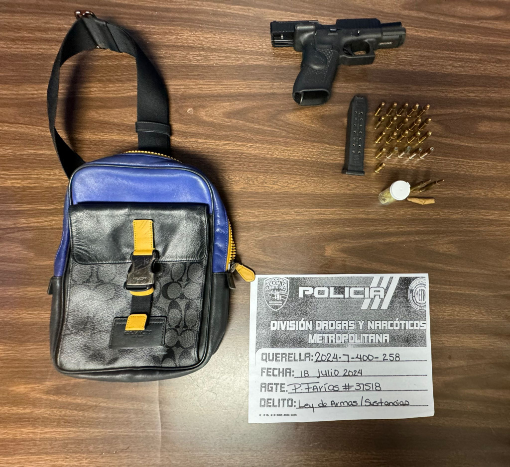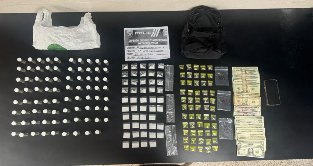 Dwaight Torres Marrero, de 32 años, y Rachelle Burgos Casanova, de 33 años, fueron arrestados en la calle Manuel Enrique con una pistola Glock, municiones y marihuana. En la calle Manuel F, se hallaron armas, municiones, cocaína, heroína, marihuana y $338 en efectivo.