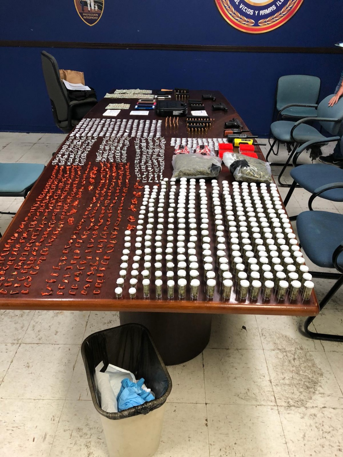 A los detenidos se les ocupó una Pistola Glock, Calibre .40, con dispositivo para disparar automática, 17 Municiones Calibre .40, 2 Cargadores Glock y $899.00 en efectivo.