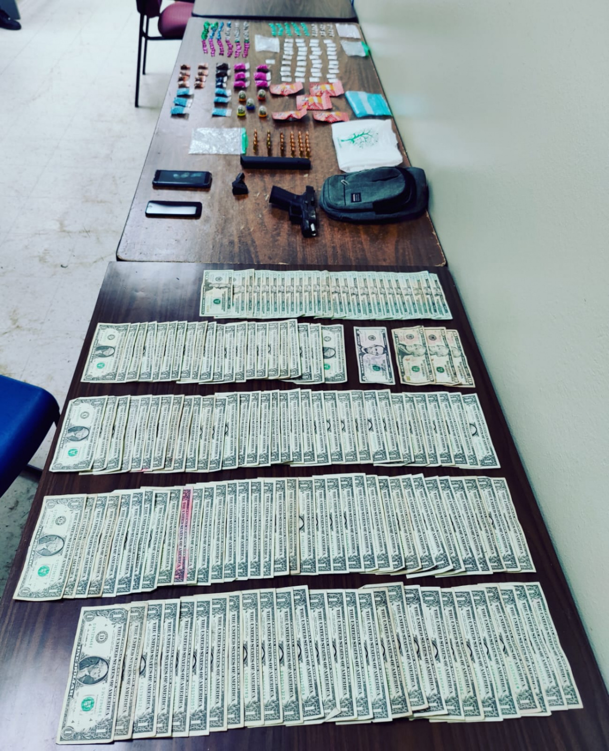 A este se le ocupó una Pistola Glock 19 negra cargada con 29 municiones, 39 bolsas de cocaína, 45 bolsa de crack, 34 bolsas de marihuana, 100 decks de heroína y $631 en efectivo.