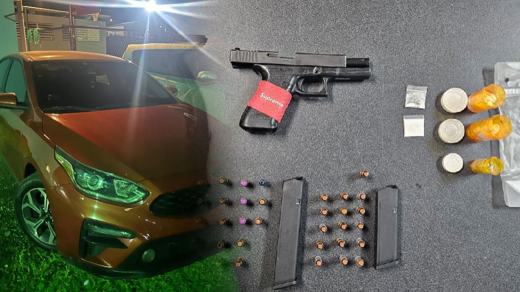 Durante la intervención, se le ocupó una pistola Glock modelo 22 calibre .40, dos cargadores, 34 municiones calibre .40, dos bolsas de cocaína, tres potes de medicamentos controlados y un vehículo Kia Forte 2021 color bronce.