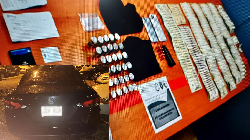 Además, se incautó un vehículo Nissan Versa color negro de cuatro puertas, dentro del cual se encontraron un cargador calibre 9mm, nueve municiones 9mm, dos teléfonos celulares, 30 envases cilíndricos con marihuana y $1,030.00 en efectivo.
