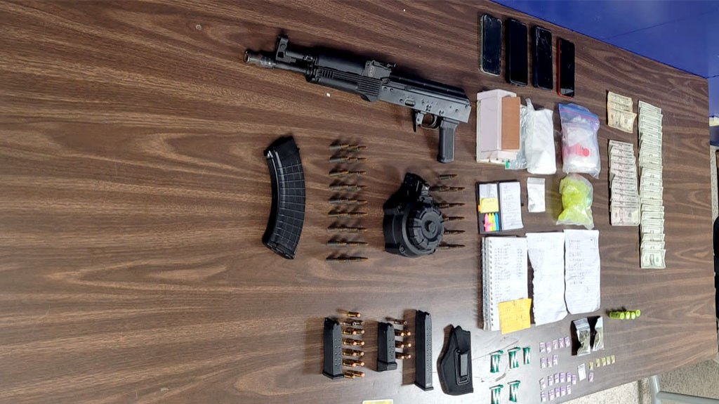 Durante la diligencia, se incautaron varias armas y sustancias ilícitas, incluyendo un rifle AK-47, municiones, cargadores de pistola Glock, cocaína, crack, marihuana, pastillas y $107 en efectivo.