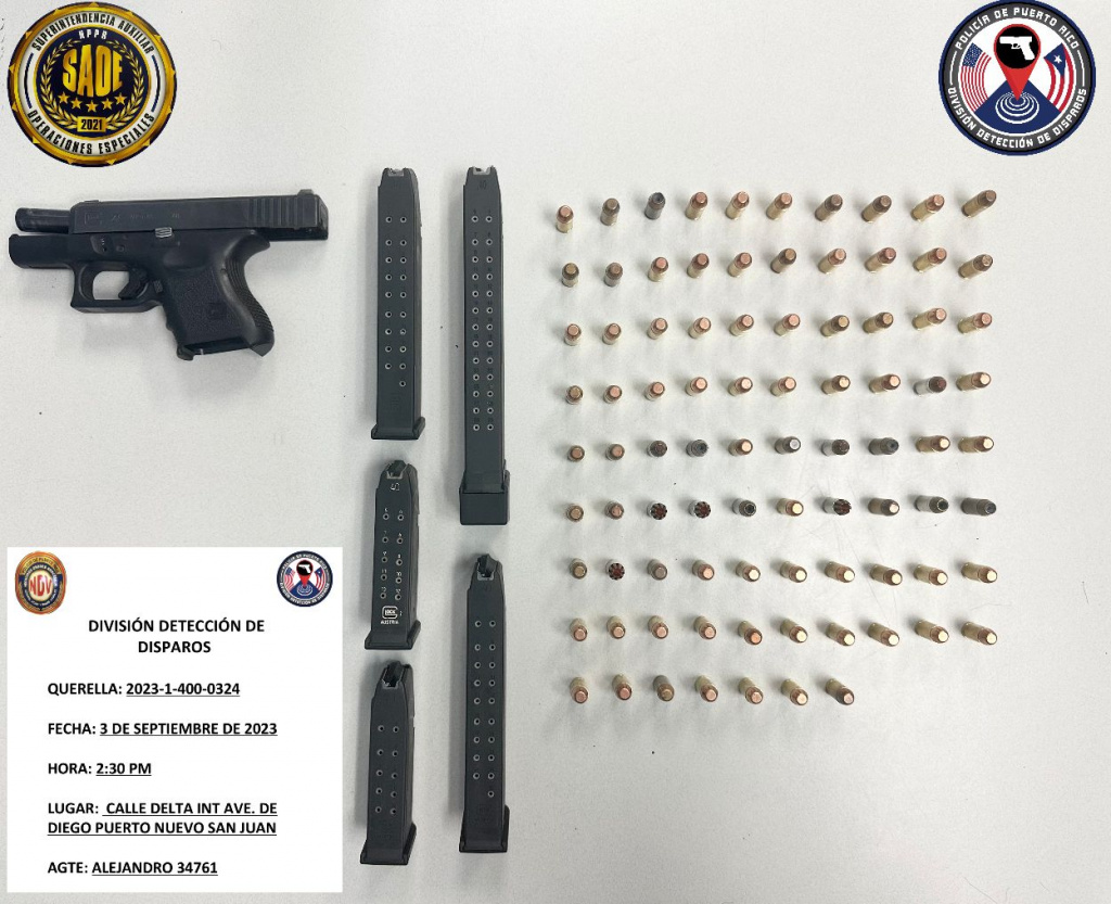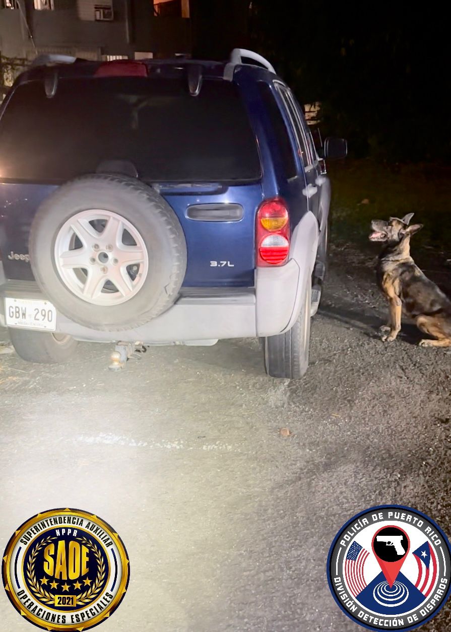 En una intersección de la avenida José De Diego en Puerto Nuevo, un perro del Negociado de la Policía marcó un Jeep Liberty de color azul. La jueza Darelis López Rosario, del Tribunal de San Juan, expidió una orden de registro y allanamiento para el vehículo. En su interior, se confiscó una pistola Glock 27, calibre .40, color negro, junto con cinco cargadores y 87 municiones calibre .40.