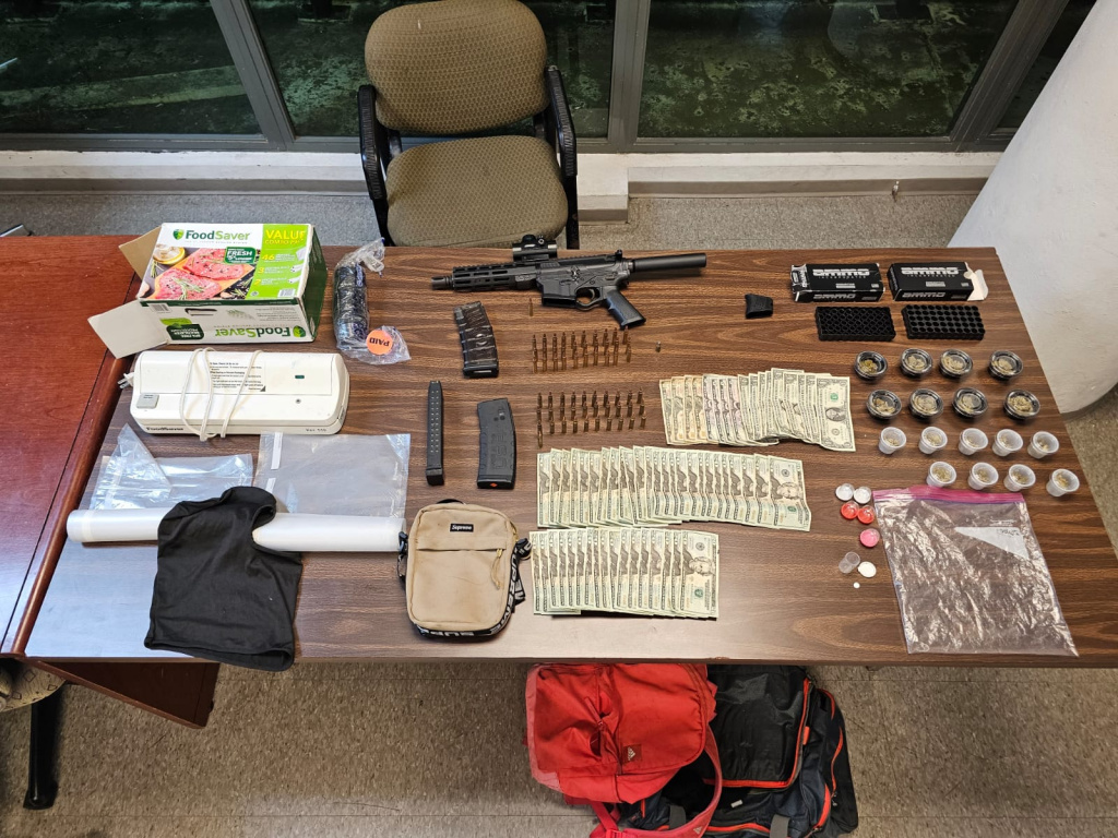 Durante la intervención, uno de los perros K-9 alertó a los oficiales sobre un vehículo Toyota Yaris, donde se podía observar parte del cañón de un arma larga. Luego de obtener una orden de registro y allanamiento, se incautaron varios objetos del vehículo, incluyendo un rifle American Tactical de calibre múltiple, dos cargadores de rifle, un cargador vacío de pistola Glock, 62 municiones de calibre .223, una munición 9mm, y 909 dólares en efectivo.
