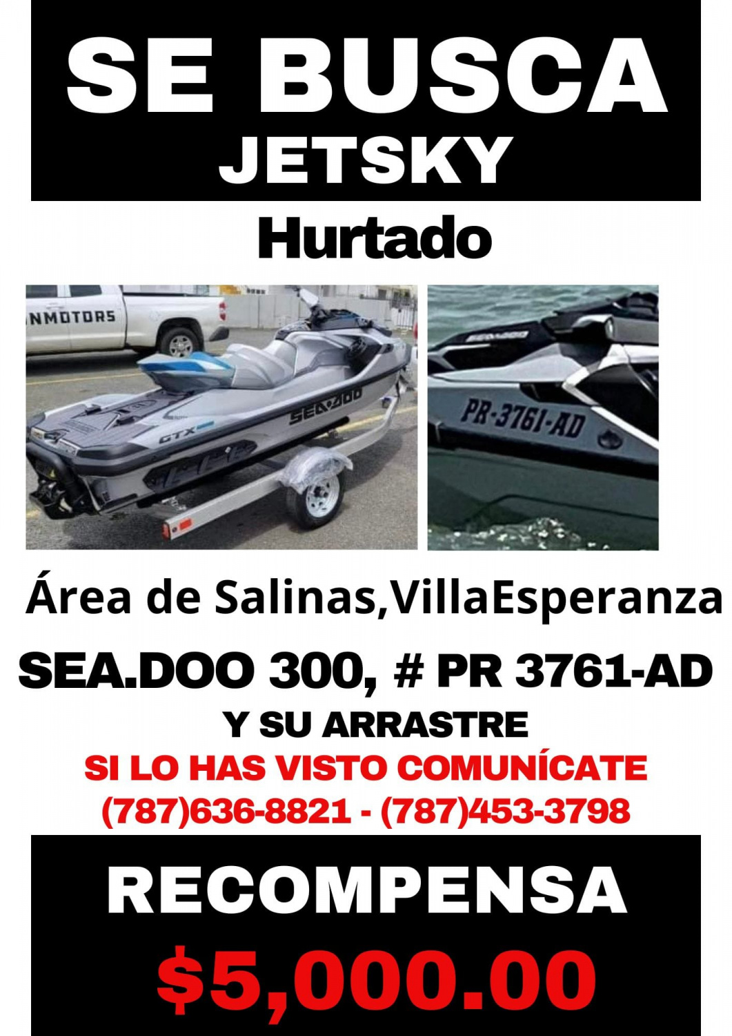 El dueño de un Sea-doo 2021 que fue robado en Salinas ofrece 5 mil dólares de recompensa a quien de información que conduzca a localiza la maquina robada.