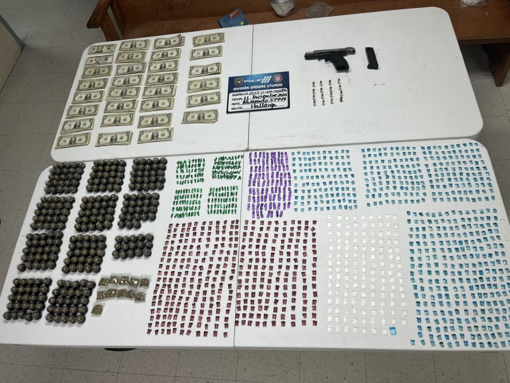 Además, en el residencial se hizo un importante hallazgo, incluyendo una pistola Ruger calibre 9 milímetros, un cargador y 16 municiones también calibre 9 milímetros. Además de las armas, se decomisaron $318 en efectivo, 263 copos de marihuana, 11 bolsas de marihuana, 287 decks de heroína, 134 bolsas de cocaína y 921 cápsulas de crack.