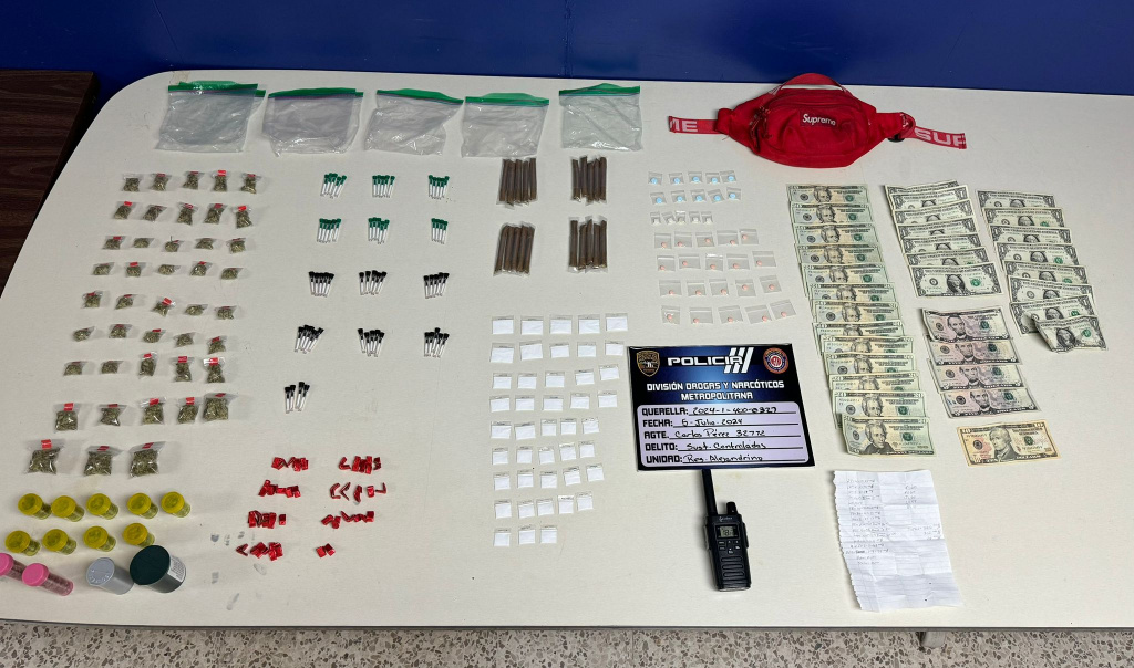 En el residencial Alejandrino arrestaron a Tomi Rodríguez Meléndez a quien le ocuparon: 82 Cápsulas de crack; 48 Bolsas de cocaína; 29 decks de heroína; 37 bolsas; 10 copos y nueve cigarros, todo de Marihuana. Además, de 39 pastillas y