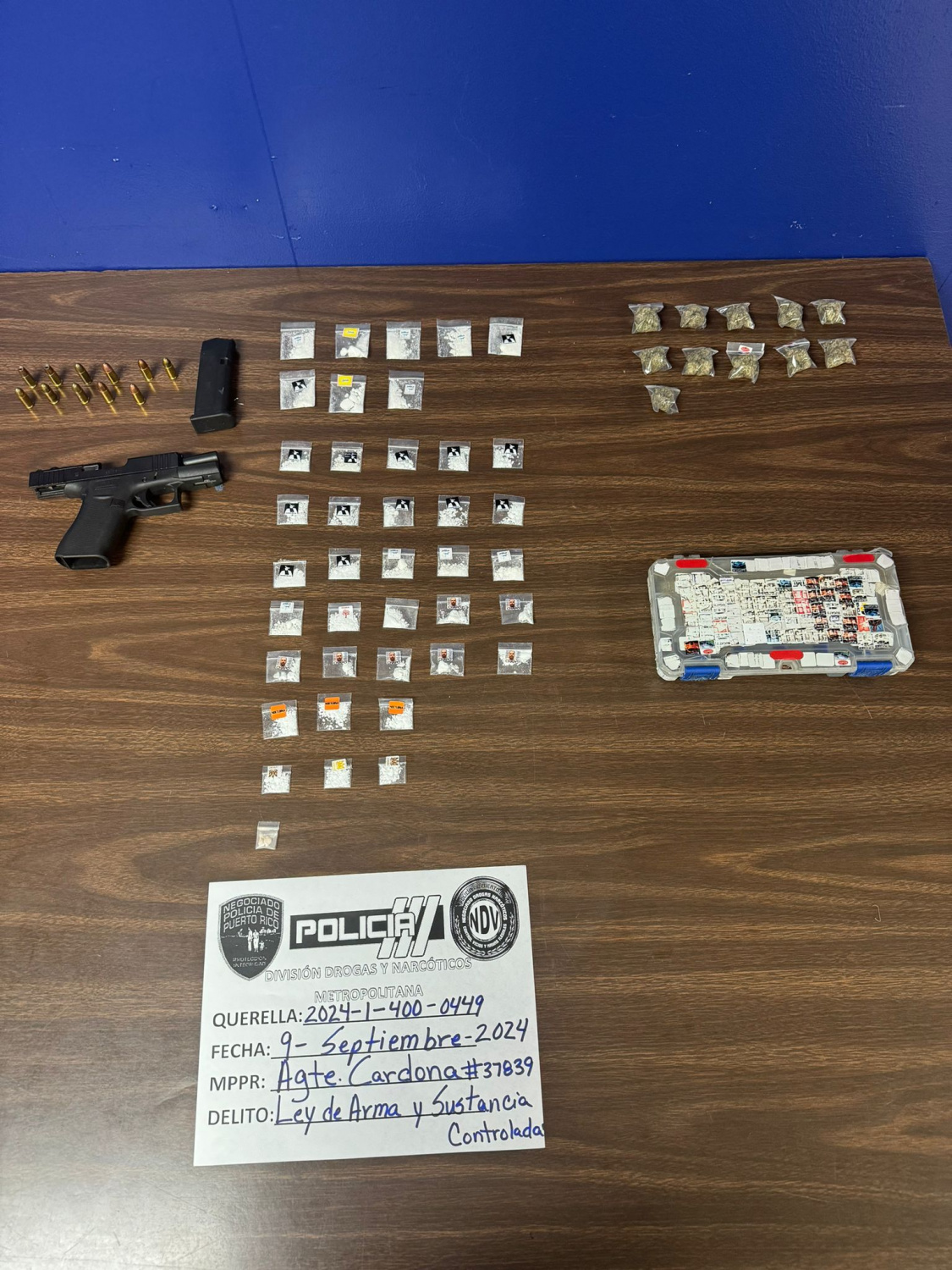 Por otra parte, en la barriada La Perla en San Juan se arrestó a Wilfredo Figueroa Vidal de 21 años, 40 bolsas de cocaína, 13 bolsas de marihuana, dos copos de marihuana, 12 pastillas y $177 en efectivo.  Además, se realizó el hallazgo de una pistola Glock, 43x calibre 9 milímetros, un cargador de pistola, 11 municiones calibre 9 milímetros, 49 bolsas de cocaína y 16 bolsas de marihuana y 18 pastillas.