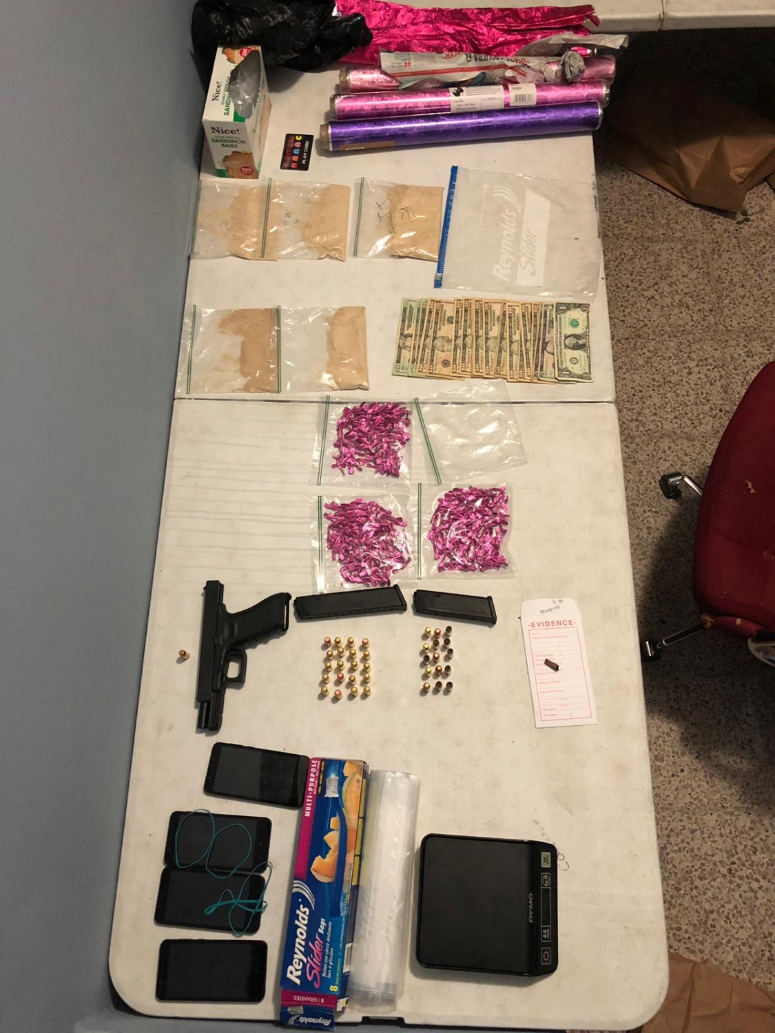 En el allanamiento la policía ocupó 300 Deck de heroína 5 bolsas zip lock medianas con polvo de Heroína una pistola marca Glock modelo 22 cal 40 con dos cargadores, 36 municiones $572.00 en dinero efectivo y parafernalia para procesar la droga.