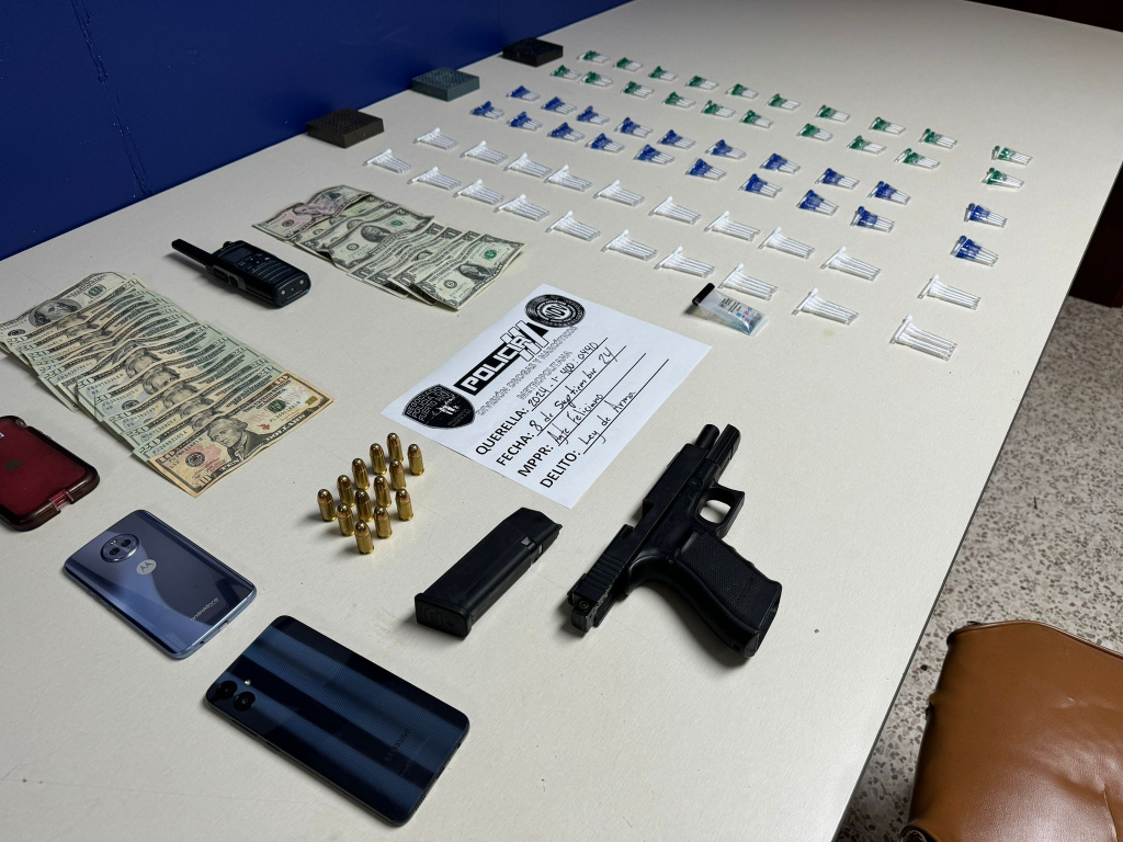 En Jardines de Country Club, San Juan, se arrestó a Wilmer Alemán Pérez, de 40 años, con una pistola Glock, municiones, 300 cápsulas de crack y $365 en efectivo; y a John Michael Cabrera, de 20 años, con 212 cápsulas de crack, 25 bolsas de cocaína, 49 decks de heroína, marihuana y $469.