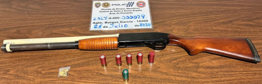 En la urbanización Verde Mar de Humacao, se arrestó a Alexis Parrilla Ocasio, de 42 años. Durante el operativo, se le confiscó una escopeta marca Winchester, seis cartuchos calibre 12 y una bolsa de marihuana. La agente Doris Burgos lideró esta investigación.