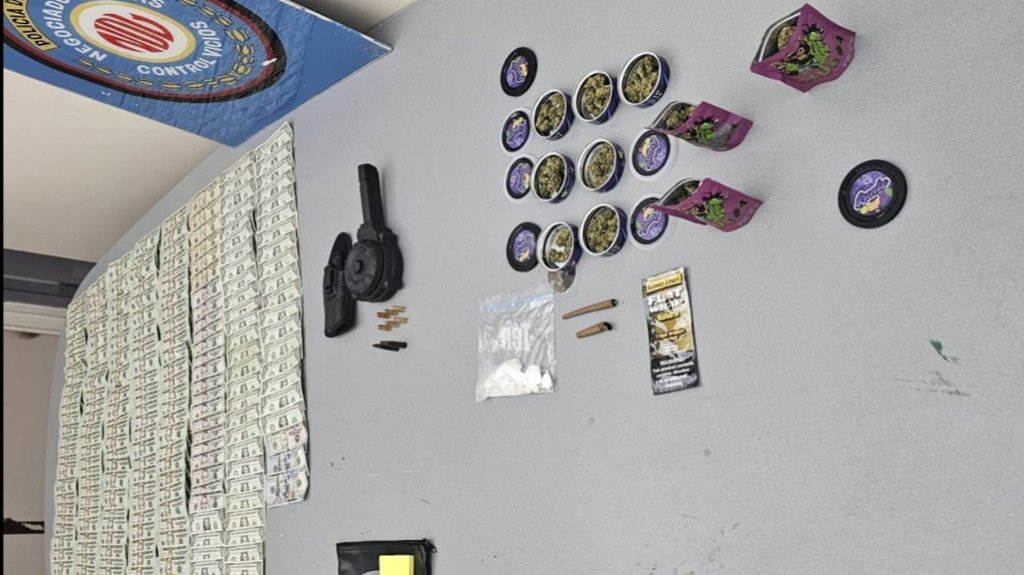 En la operación, los agentes confiscaron cocaína, tres bolsas de marihuana, siete latas cilíndricas de marihuana, un cargador tipo tambor de pistola calibre 9 milímetros, 6 municiones calibre 9 milímetros, dos municiones calibre 7.62 x39 y $3,431.00 en efectivo.