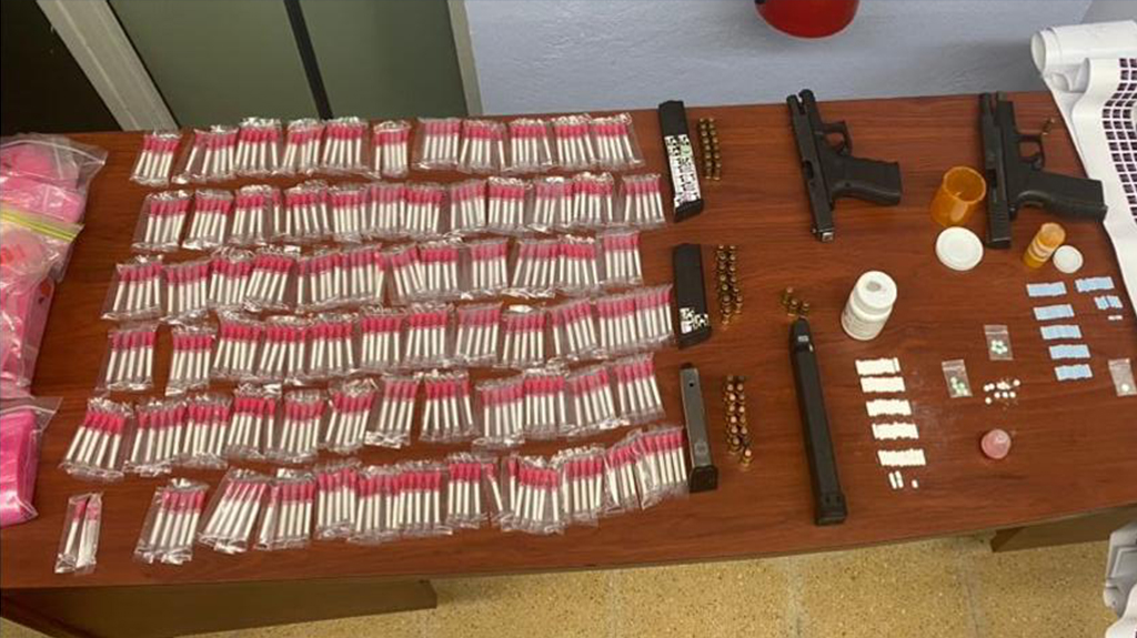 En el edificio 13 del residencial Juan Jiménez García fueron arrestados Lenne Carrasquillo de 23 años, Christian Ortiz de 36, Ana Serrano de 49 y Moesha Carrasquillo de 23 y en el lugar fueron ocupados tres (3) envases de marihuana, dos (2) bolsas de marihuana, 5,485 dólares en efectivo y un vehículo Toyota Camry color negro, año 2006. Posteriormente, luego de la orden de registro expedida por la juez Ingrid Caro del tribunal de Caguas, en el interior del vehículo se ocupó una pistola marca Glock, calibre .40 con aditamento para disparos automáticos, cinco (5) cargadores .40, un cargador tipo tambor .40, un cargador 9 milímetros, 102 municiones calibre .40, 10 municiones calibre 9 milímetros y 296 bolsitas de cocaína.