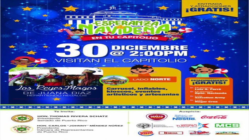 Dijo Rivera Schatz en un anuncio en su cuenta de Facebook: "Te invito a que este sábado, 30 de diciembre de 2017; lleves a tus niños al evento #EsperanzaNavideñaEnTuCapitolio, donde tendremos la visita de los Reyes Magos de Juana Díaz, quienes estarán repartiendo regalos en el lado Norte del Capitolio”.