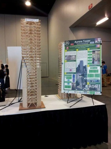 Durante la competencia, la maqueta de cinco pies, construida con madera balsa y denominada La Torre Aurora, resistió tres terremotos con una magnitud máxima de 8.9 en la escala Richter.