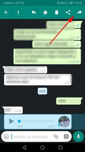 Para que WhatsApp no se chive cuando escuchemos un mensaje de audio, lo que vamos a hacer es utilizar otro sencillo truco del que ya hablamos en su día. Nos referimos a la opción de enviarnos un mensaje a nosotros mismos en WhatsApp, por lo tanto, lo que vamos a hacer es crear un chat en la aplicación con nosotros mismos y nos reenviaremos el audio que hemos recibido. Para ello, una vez que hemos recibido el mensaje de voz en un chat, abrimos esa conversación y sin reproducir el audio lo tocamos y mantenemos la pulsación para que se seleccione el mensaje. A continuación, tocamos sobre el icono de la flecha hacia la derecha que aparece en la parte superior de la pantalla y que nos permite reenviar el mensaje y seleccionamos el chat con nosotros mismos que acabamos de crear.